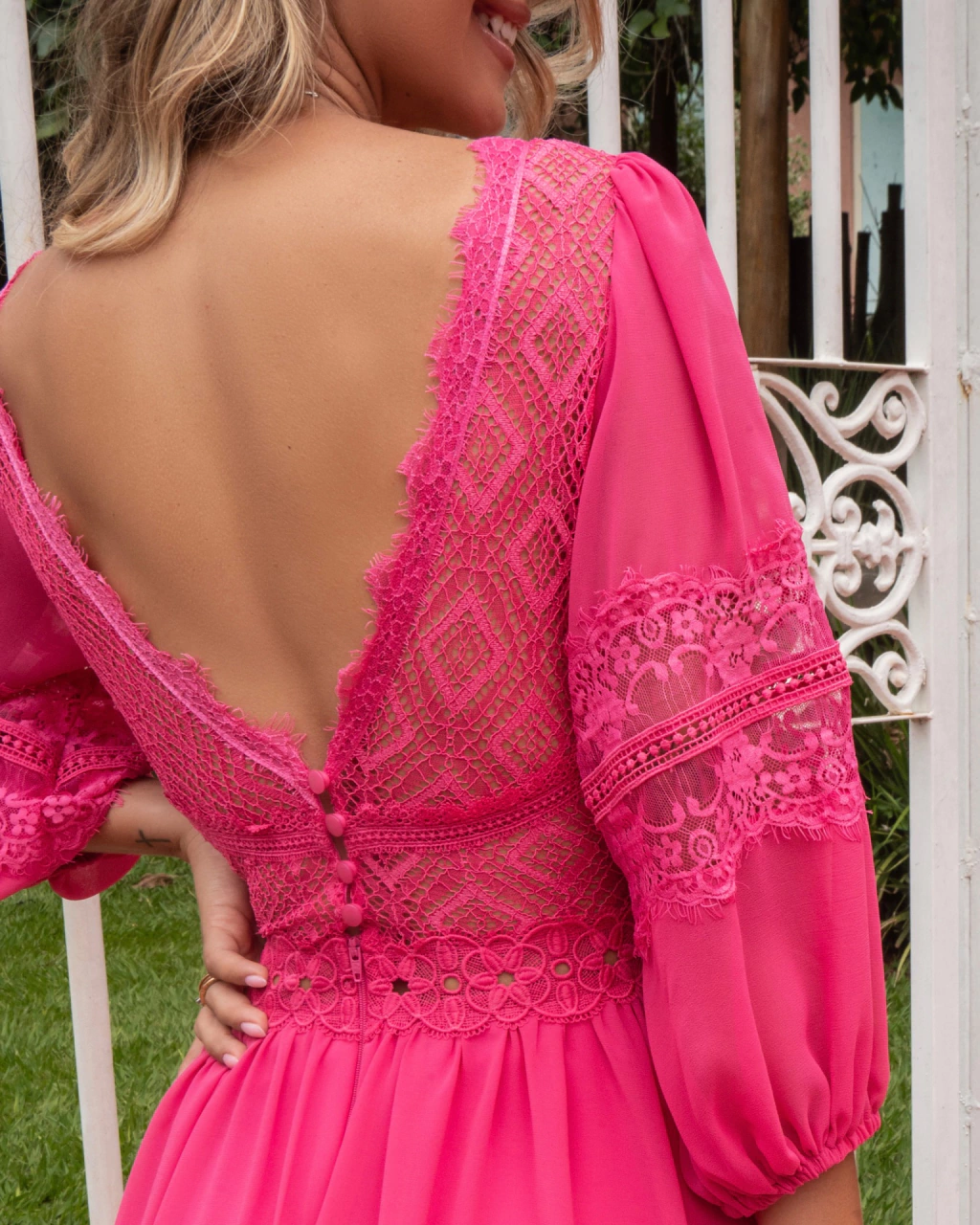 ♡ (Nas costas um decote V com o mesmo acabamento na renda chantilly, transparência, fechamento em botões e ziper.
